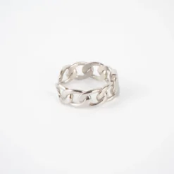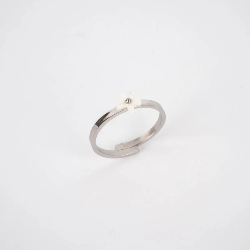 Bague en acier sur laquelle est soudé et serti une jolie fleur blanche en nacre.
