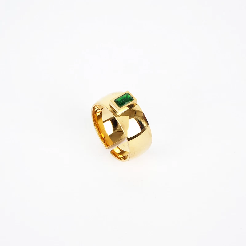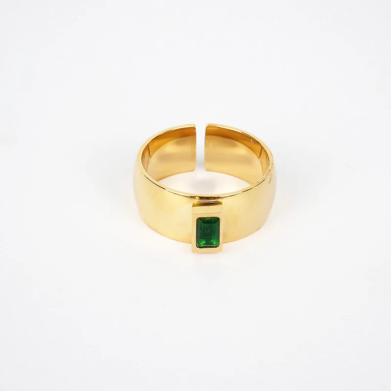 Bague en acier doré à l’or fin ajustable. Délicate et large cette bague est d’un oxyde de zirconium vert.