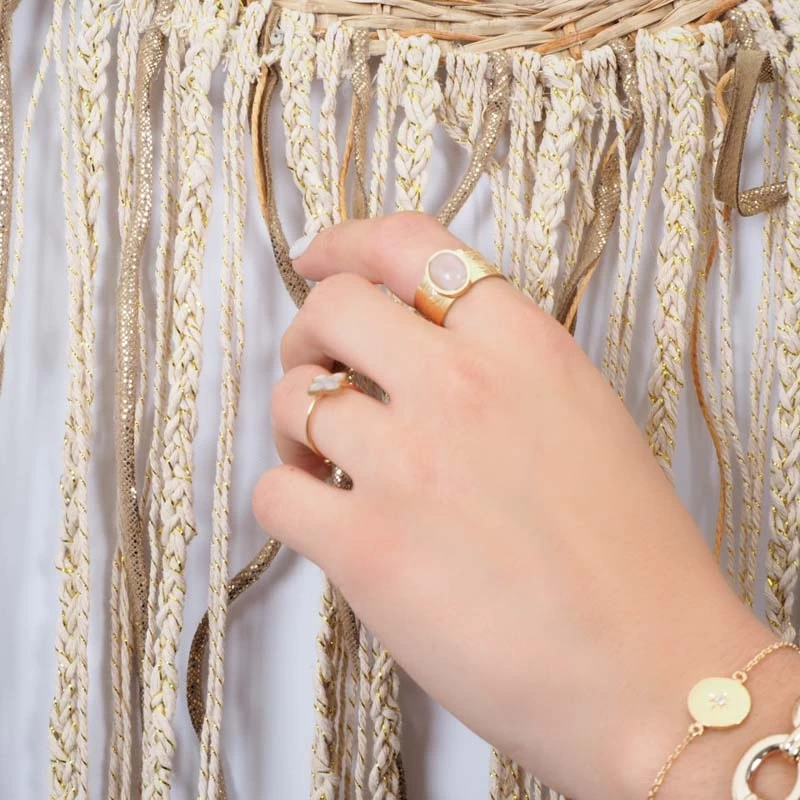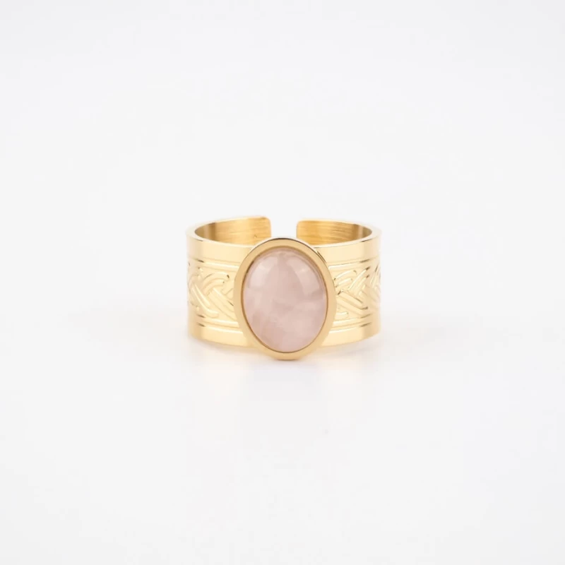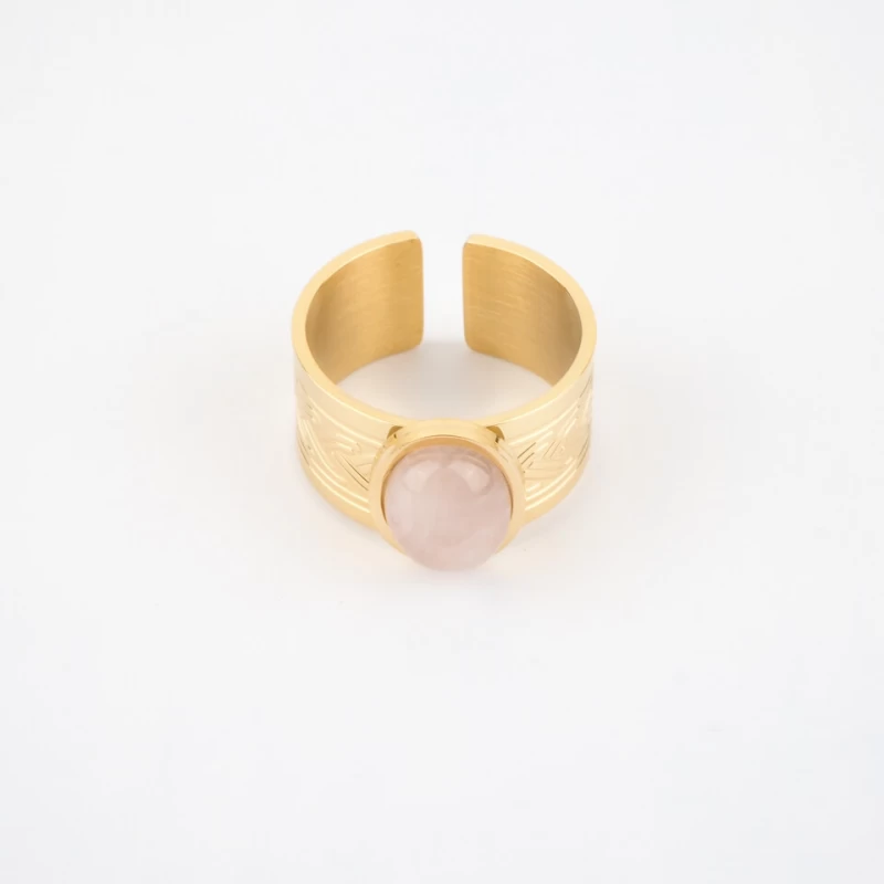 Bague ajustable en acier doré, sertie d’un cabochon de pierre naturelle en quartz rose.