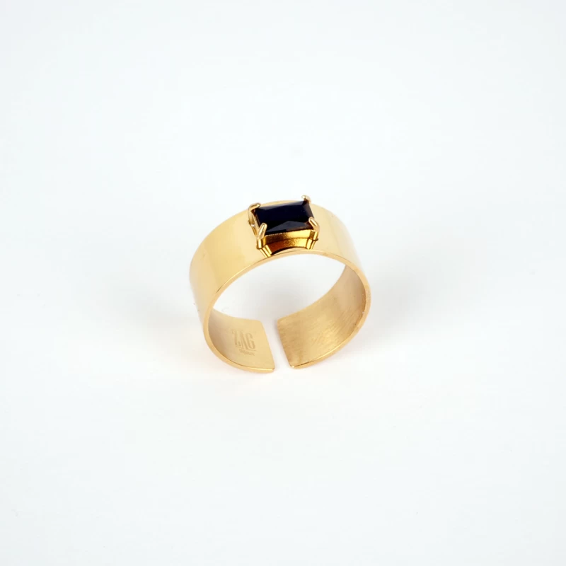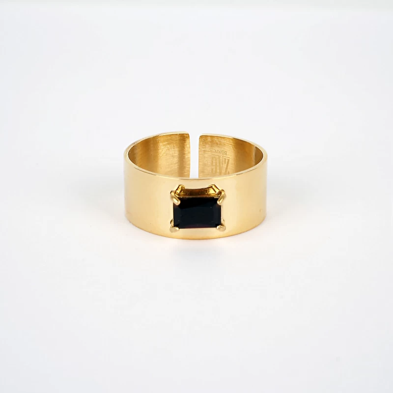 Bague en acier doré à l’or fin ajustable. Délicate et large cette bague est d’un oxyde de zirconium noir.