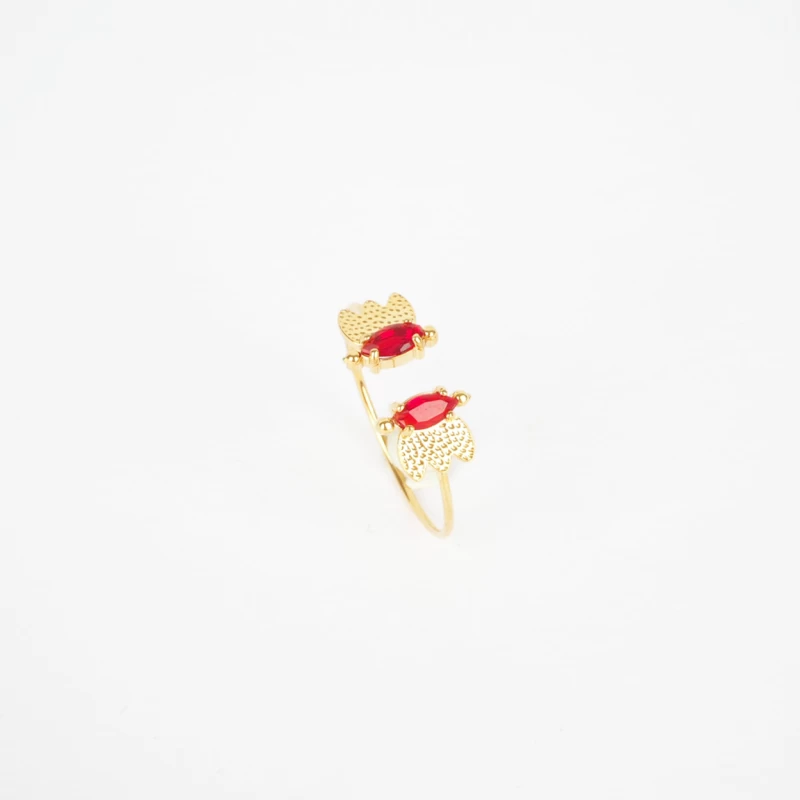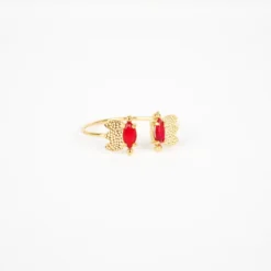 Bague en acier doré à l’or fin ajustable sur le dessus ornée deux oxydes de zirconiums colorés rouges.