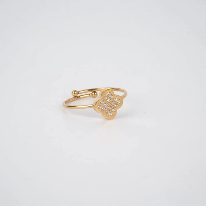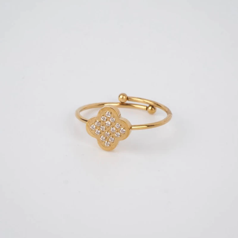 Bague en acier doré à l’or fin sur laquelle est soudé un motif de fleur, serti de zirconiums.