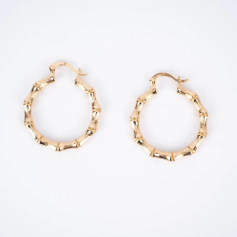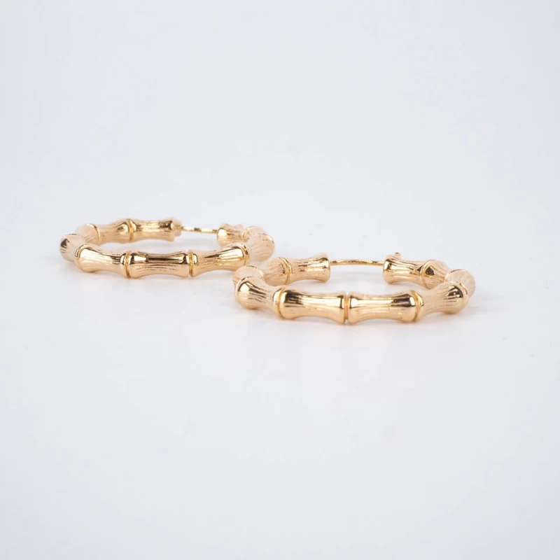 Pomme Cannelle bijoux vous propose ces élégantes créoles bambou en plaqué or. Elles s’assortiront parfaitement avec le jonc bambou de la même collection.