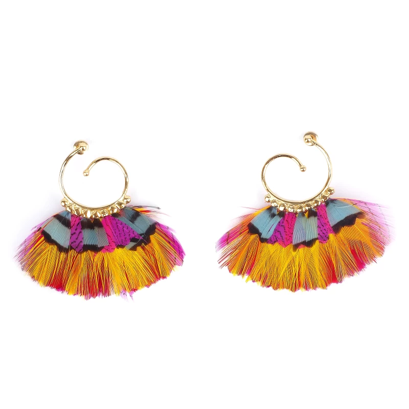 Boucles d’oreilles dorées à l’or fin, parées de plumes véritables de différentes couleurs. Ces plumes se positionnent de face, permettant un alignement avec le visage et mettant en valeur ces belles pièces.