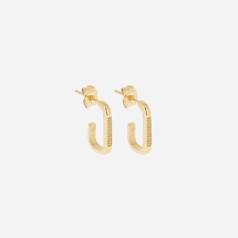 Boucles d’oreilles créoles rectangulaires serties d’oxydes de zirconiums en acier inoxydable doré à l’or fin.