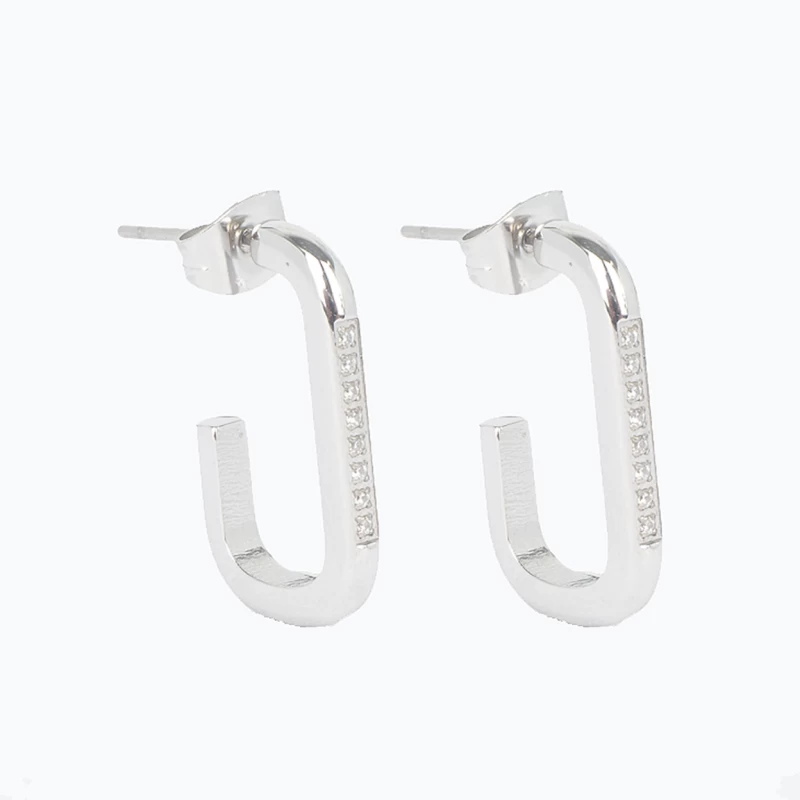 Boucles d’oreilles créoles rectangulaires serties d’oxydes de zirconiums en acier inoxydable.
