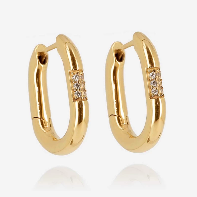 Boucles d’oreilles créoles ovales et lisses serties d’oxydes de zirconiums en acier inoxydable doré à l’or fin.