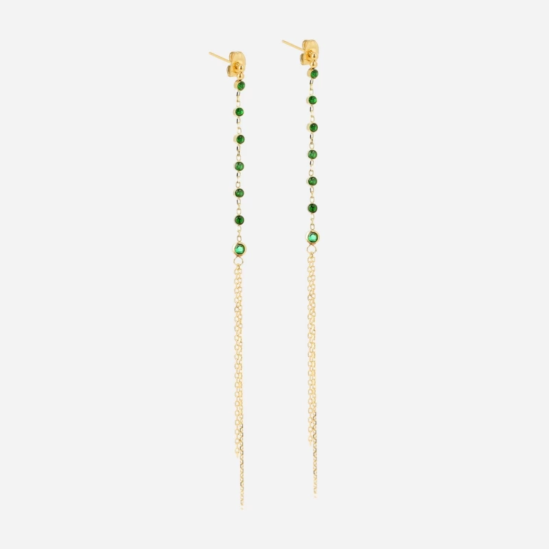 Boucles d’oreilles longues en acier doré à l’or fin sur lesquelles des zirconiums sont parsemés sur une chaînette.