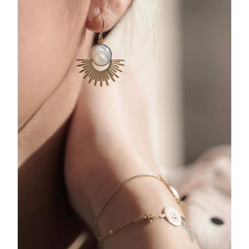Apportez éclat, lumière et chaleur à votre visage avec ces superbes boucles d’oreilles. On adore le mélange de la nacre blanche et du métal couleur or.