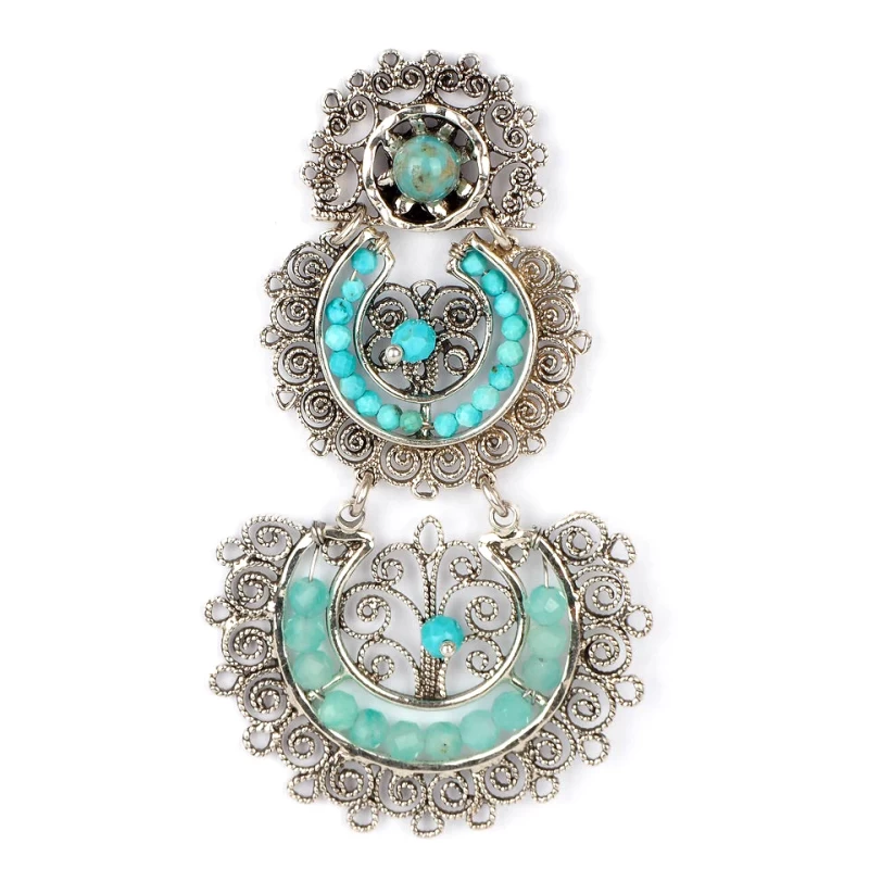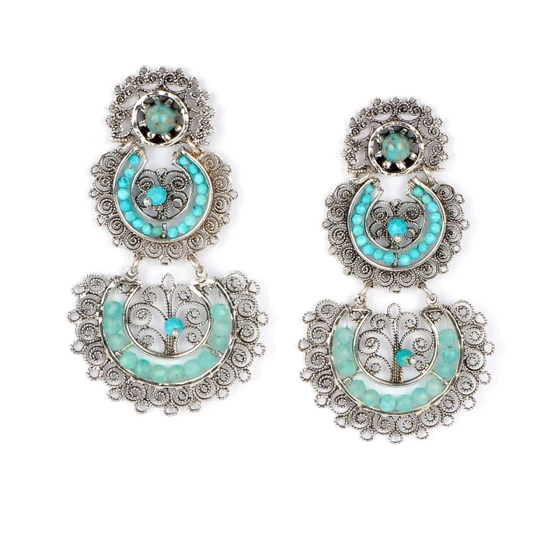 Boucles d’oreilles argentées, composées de délicates plaques en filigrane, habillées de perles en pierres fines (amazonites et turquoises).