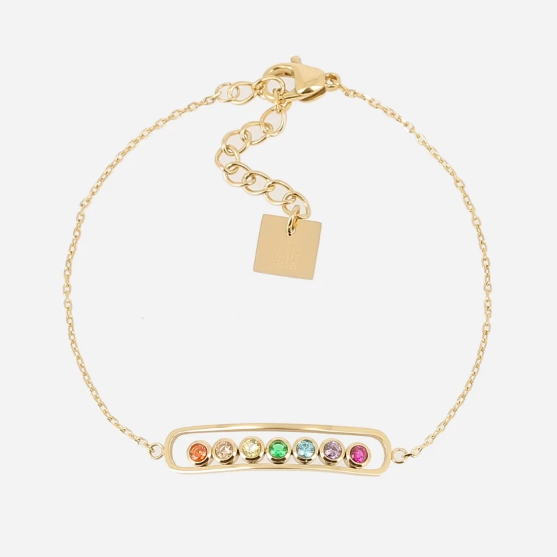 Bracelet à double chaîne en acier doré à l’or fin sur lequel se trouvent des petites pampilles en zirconiums colorés représentant les 7 chakras : racine, sacré, plexus solaire, coeur, gorge, 3ème oeil et couronne.