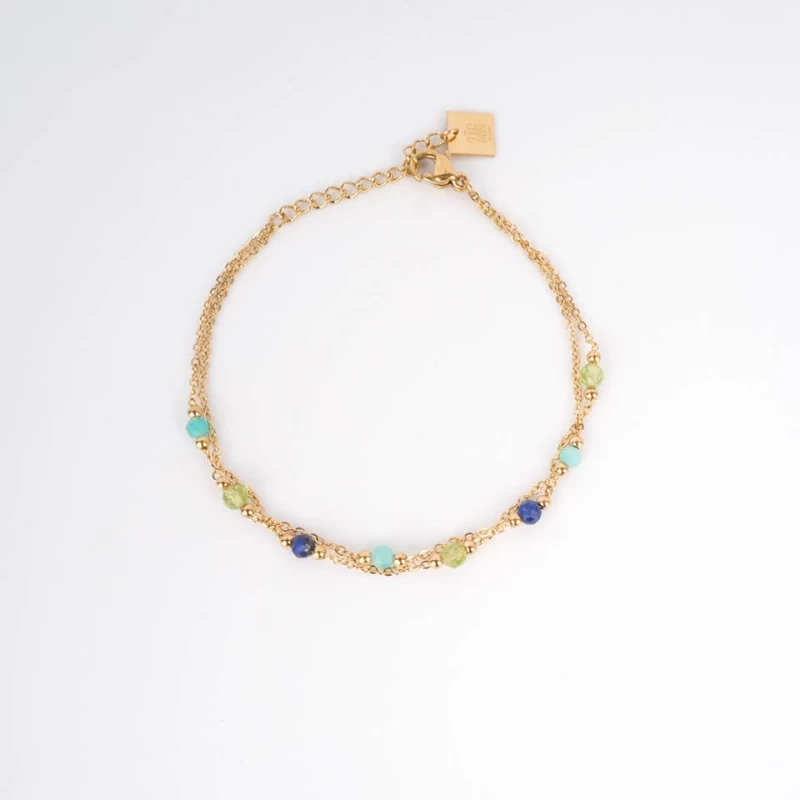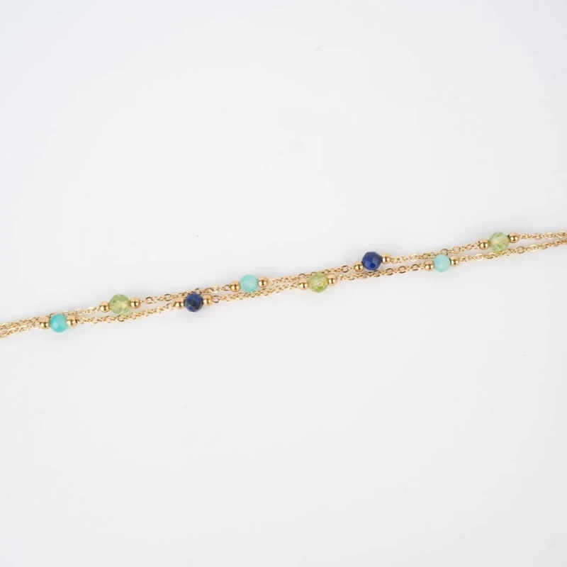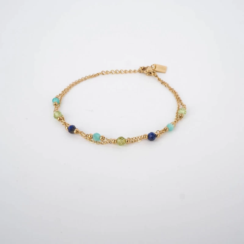 Bracelet double chaîne en acier doré à l’or fin parsemé de pierres fines.