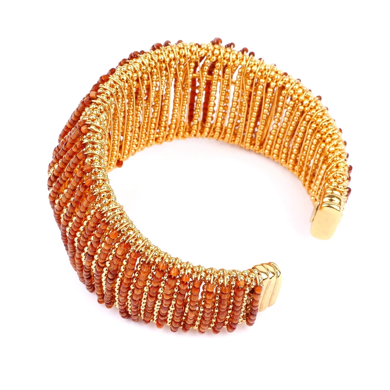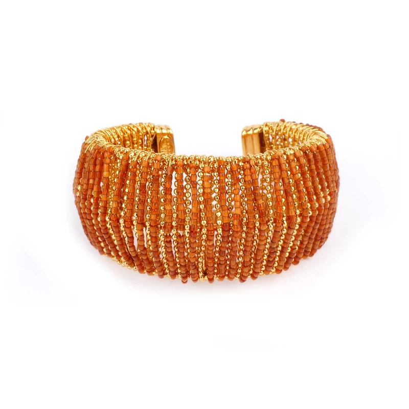 Bracelet manchette doré à l’or fin, composé d’une base de fils et perles dorées, et orné d’un habillage de perles colorées enfilées à la main. Taille ajustable.