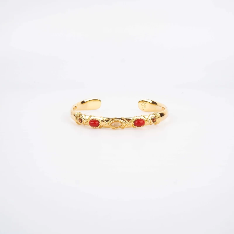 Ce bracelet jonc doré à l’or fin 24 carats est habillé de fils dorés et rehaussé de cabochons colorés. Les extrémités sont martelées à la main et poinçonnées d’un soleil.