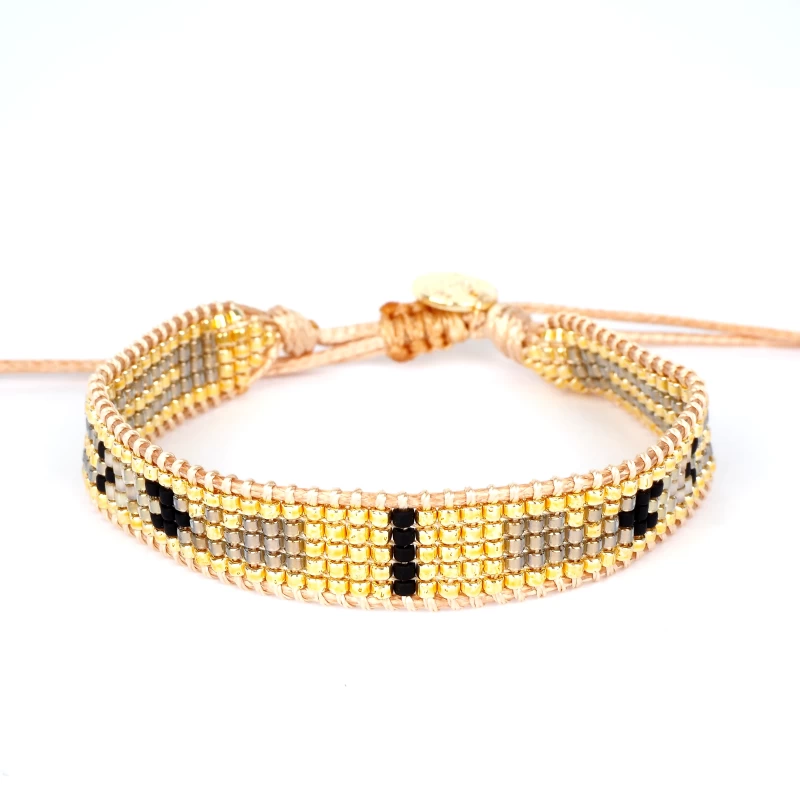 Bracelet composé de perles de Miyuki dorées, grises et noires.