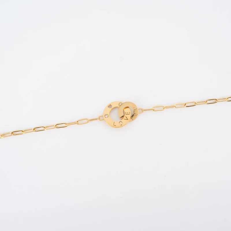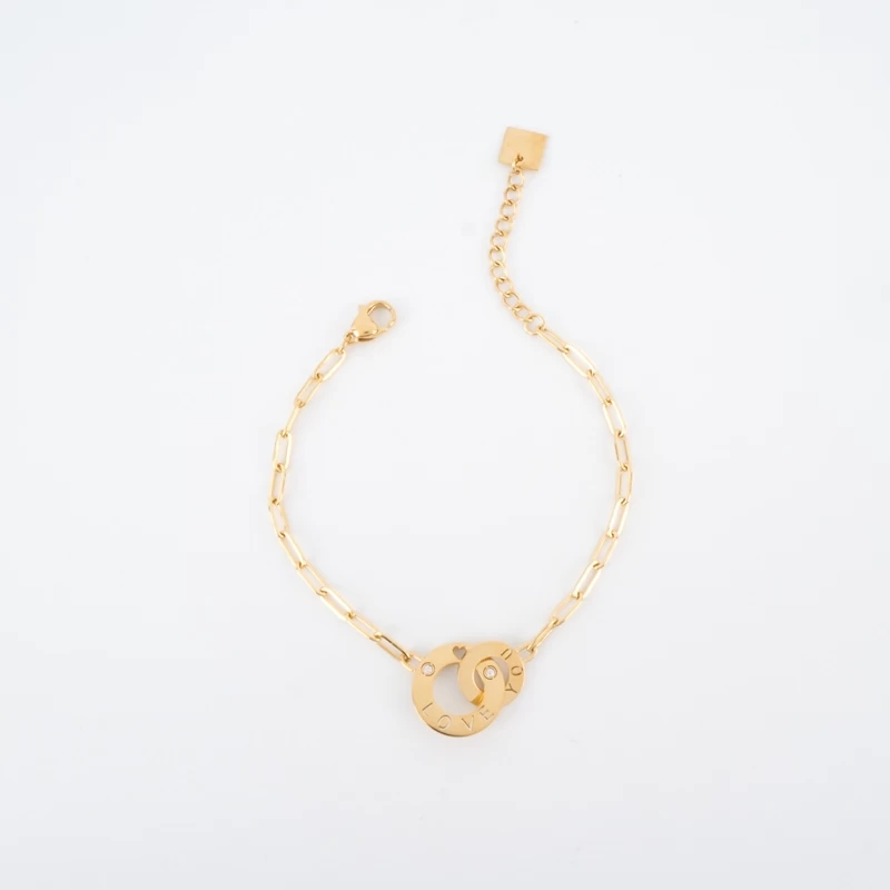 Bracelet chaînette zag bijoux en acier doré à l’or fin, 2 anneaux sur lesquelles gravés LOVE.