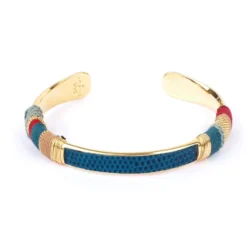 Bracelet jonc doré à l’or fin habillé de fils de couleurs et de fils dorés. Accordant végétal et animal, organique et minéral, le bracelet Massai invite au voyage. Taille ajustable.
