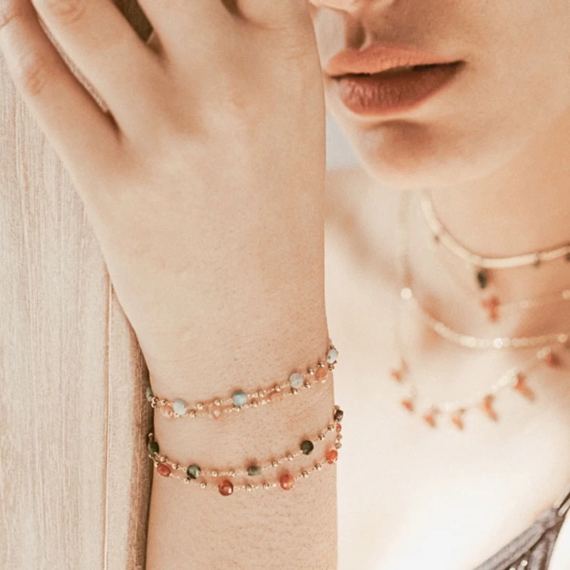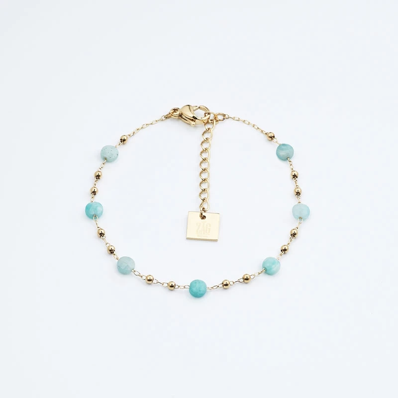 4Bracelet chaînette en acier doré à l’or fin parsemé de petites boules dorées et de pierres fines taillées à la main.