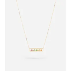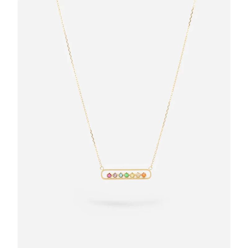 Collier en acier doré à l’or fin sur lequel se trouve les couleurs des 7 chakras : racine, sacré, plexus solaire, cœur, gorge, 3ème œil et couronne.