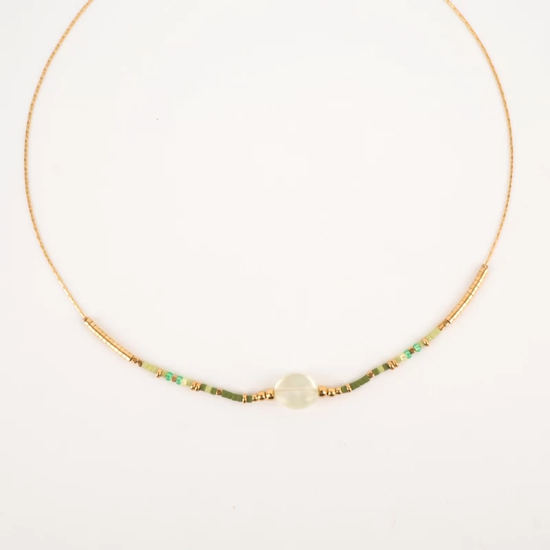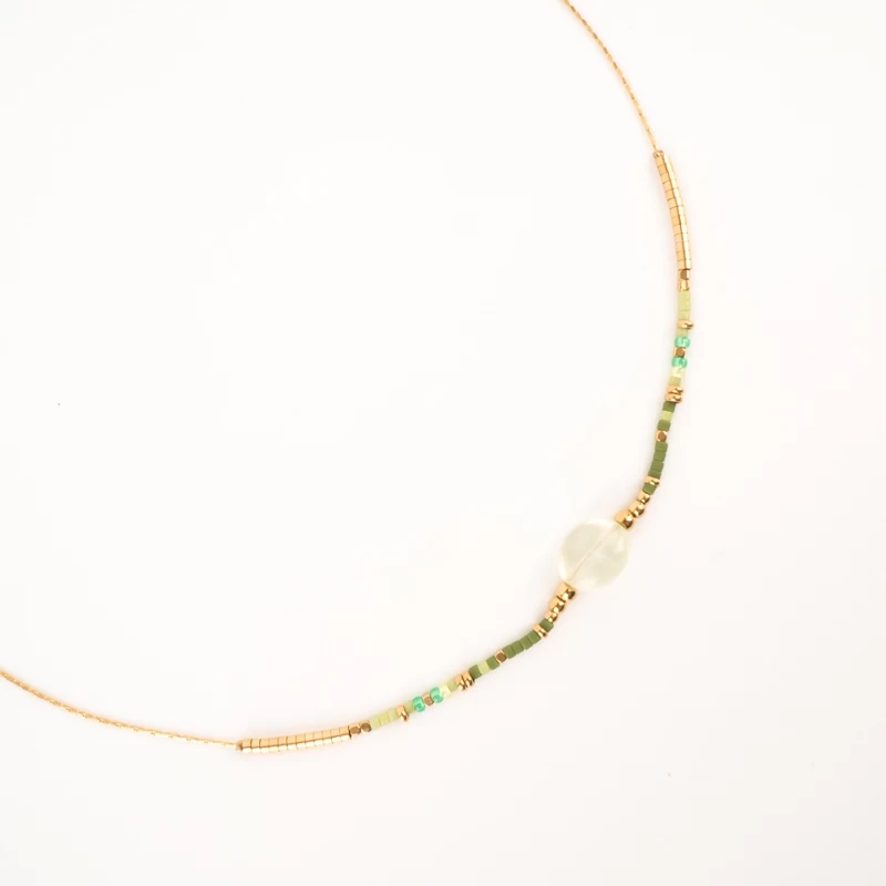 Collier en acier uni ou doré à l’or fin sur lequel sont attachées des pierres semi-précieuses vertes.