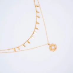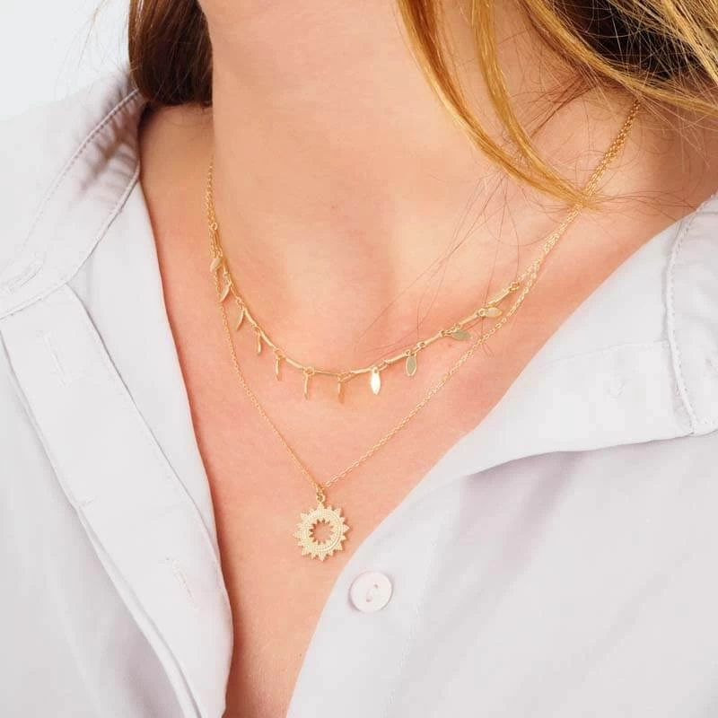 Pomme Cannelle bijoux vous propose cet élégant collier multirangs représentant des épis et un soleil. Parfait pour un effet « stacking ».