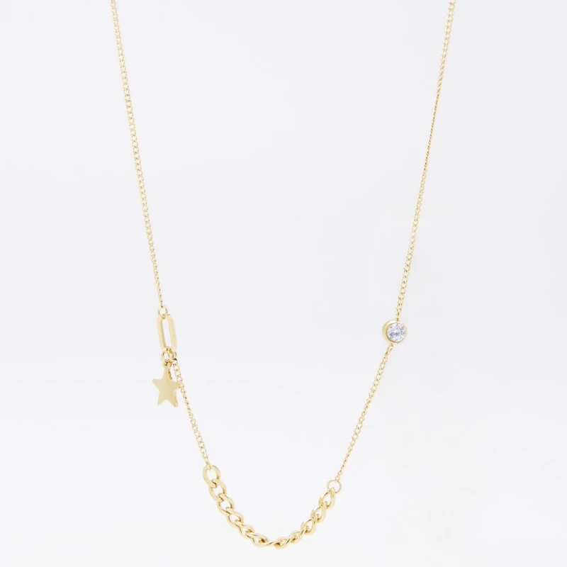 Collier en acier inoxydable doré à l’or fin sur lequel se trouvent une maille, une étoile et une un oxyde de zirconium blanc.