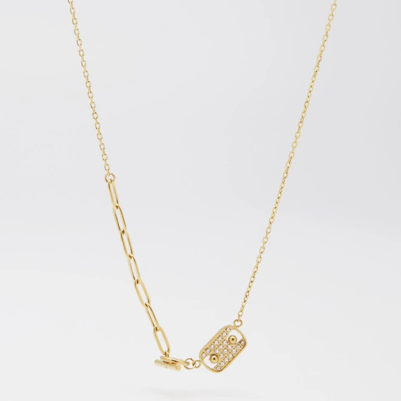 Collier en acier inoxydable doré à l’or fin sur lequel se trouvent une maille marine et une plaque ornée d’oxydes de zirconiums blancs.