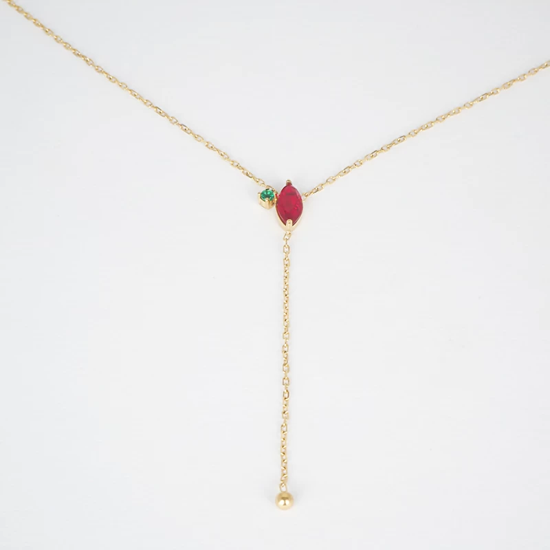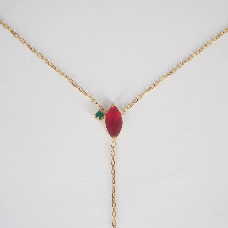 Collier cravatte en acier doré à l’or fin sur lequel se trouvent des petites pampilles en zirconiums colorés rouge.