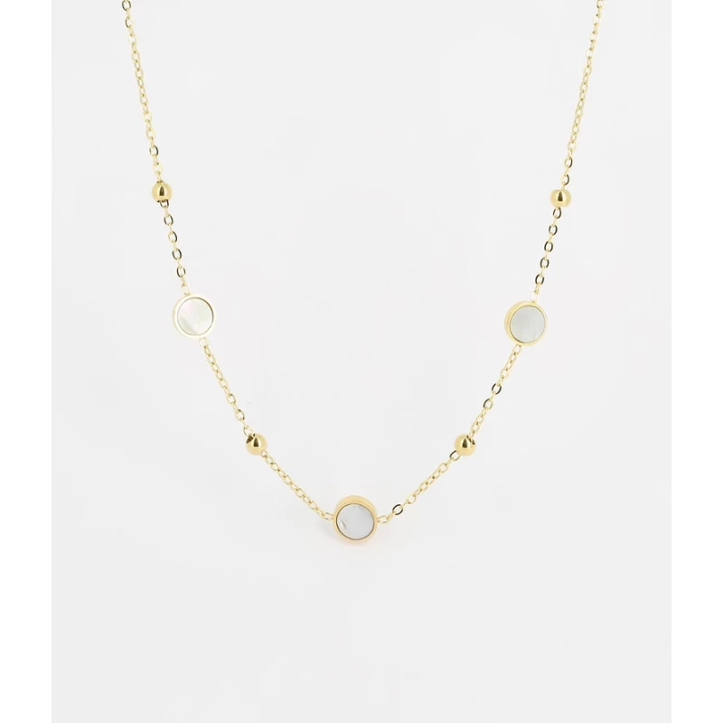 Collier en acier uni ou doré à l’or fin sur lequel sont attachées des plaques circulaires nacrées séparées par des petites boules précieuses en métal.