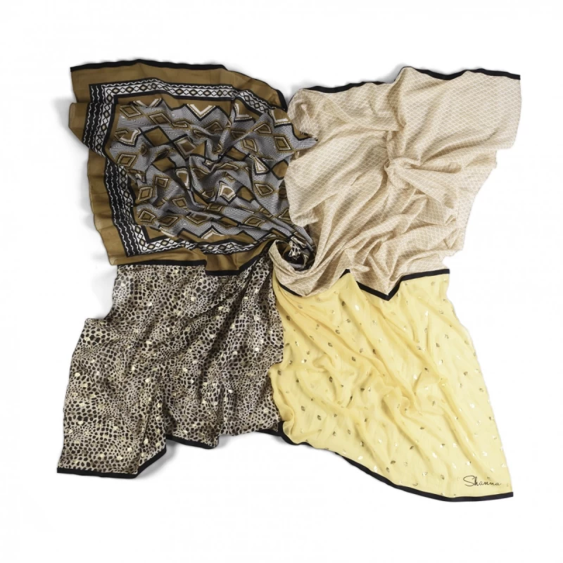 Le modèle-phare des foulards Shanna est un assemblage de quatre carrés de tissus rehaussés par des rubans. L’association de couleurs et de motifs, le mix d’imprimés et de matières, sont d’une redoutable efficacité.