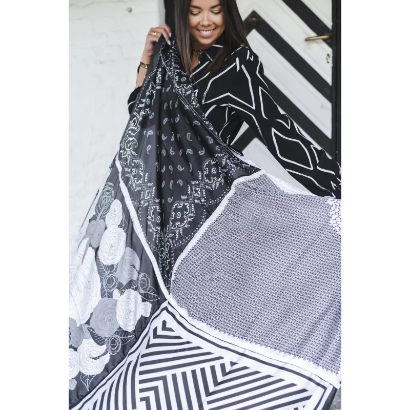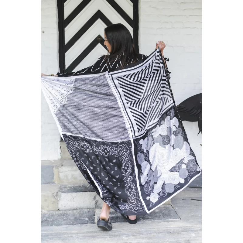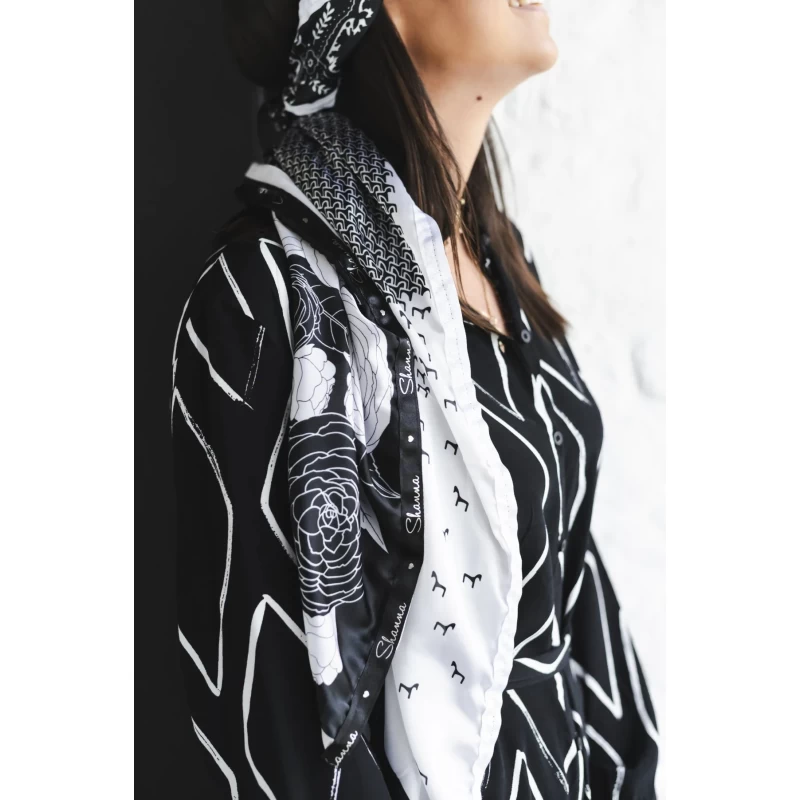 Le modèle-phare des foulards Shanna est un assemblage de quatre carrés de tissus rehaussés par des rubans. L’association de couleurs et de motifs, le mix d’imprimés et de matières, sont d’une redoutable efficacité.